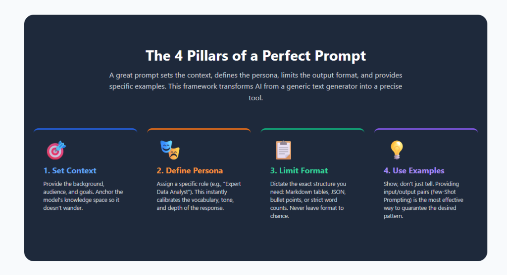 A truly great prompt goes beyond a simple question. It acts as a comprehensive brief for the AI. To master prompt engineering, you need to construct your inputs using these four fundamental pillars: